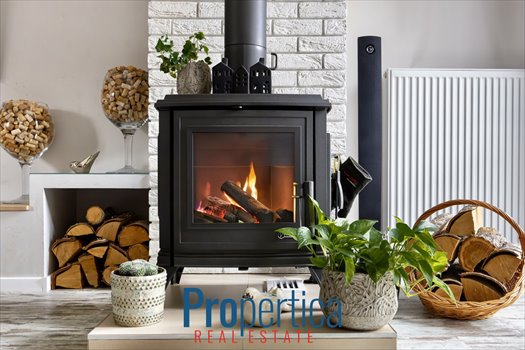 • przestronny salon z klimatycznym kominkiem i otwartą kuchnią