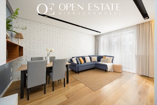Salon utrzymany jest w jasnych barwach, z dużymi oknami i wyjściem na loggię. Drewniane podłogi, naturalne światło i nowoczesna zabudowa RTV z drewnianymi akcentami tworzą przytulny klimat. Kuchnia została wykonana na wymiar, łączy białe fronty z naturalnym drewnem, co nadaje wnętrzu elegancji i ciepła. Jest w pełni wyposażona w sprzęt AGD – piekarnik, płytę indukcyjną, zmywarkę, okap i lodówkę. Liczne szafki zapewniają dużą funkcjonalność.