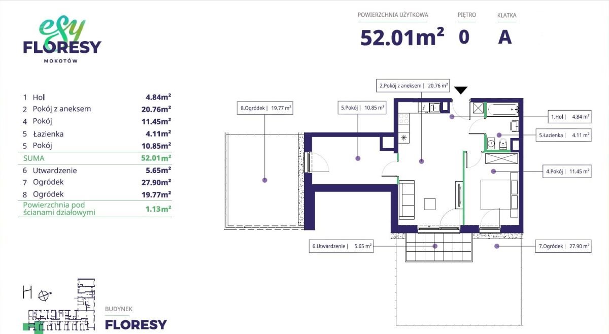 Zapraszam do zapoznania się z ofertą 3 pokojowego mieszkania o powierzchni 52,01 m2 z 2 ogródkami (27,90 m2 oraz 19,77 m2). Mieszkanie znajduje się w nowoczesnej inwestycji Esy Floresy na warszawskim Mokotowie przy ul. Cybernetyki. Lokal jest narożny na parterze graniczącym z powstającym parkiem do dyspozycji mieszkańców osiedla. Usytuowanie budynku w drugiej linii zabudowy sprawia, iż mamy ciszę od najbliższych ulic. Do mieszkania przynależy miejsce parkingowe w garażu podziemnym oraz komórka lokatorska - 2,46 m2.