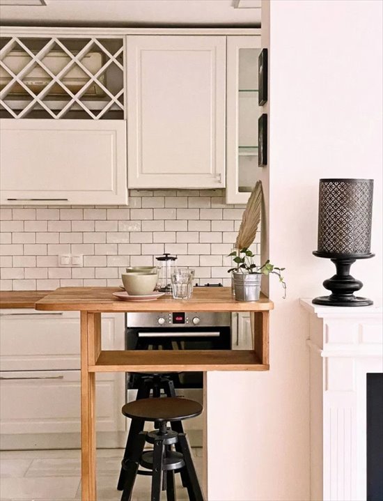2. Salon z kuchnią: lodówka z zamrażarką, zmywarka, piekarnik, płyta kuchenna, nowa rozkładana sofa trzyosobowa, biokominek, kredens z drewna egzotycznego, barek i dwa hokery, możliwość powieszenia tv (na ścianie wyprowadzone instalacje)