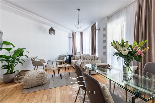 Salon w tym apartamencie to znakomite miejsce relaksu. Duże okna sięgające prawie do podłogi z szerokimi parapetami, na których można usiąść z filiżanką kawy. Przyjemne, odprężające oświetlenie wnętrza dzięki licznym żródłom światła. Salon został wyposażony w eleganckie meble i dodatki: wygodną, szeroką, rozkładaną kanapę, dwa fotele, trzy stoliki, puf, biurko z fotelem, tv, dywany, kwiaty, firanki i zasłony. W części jadalnej stoi stół z krzesłami. Piękna, drewniana podłoga z wiązu.