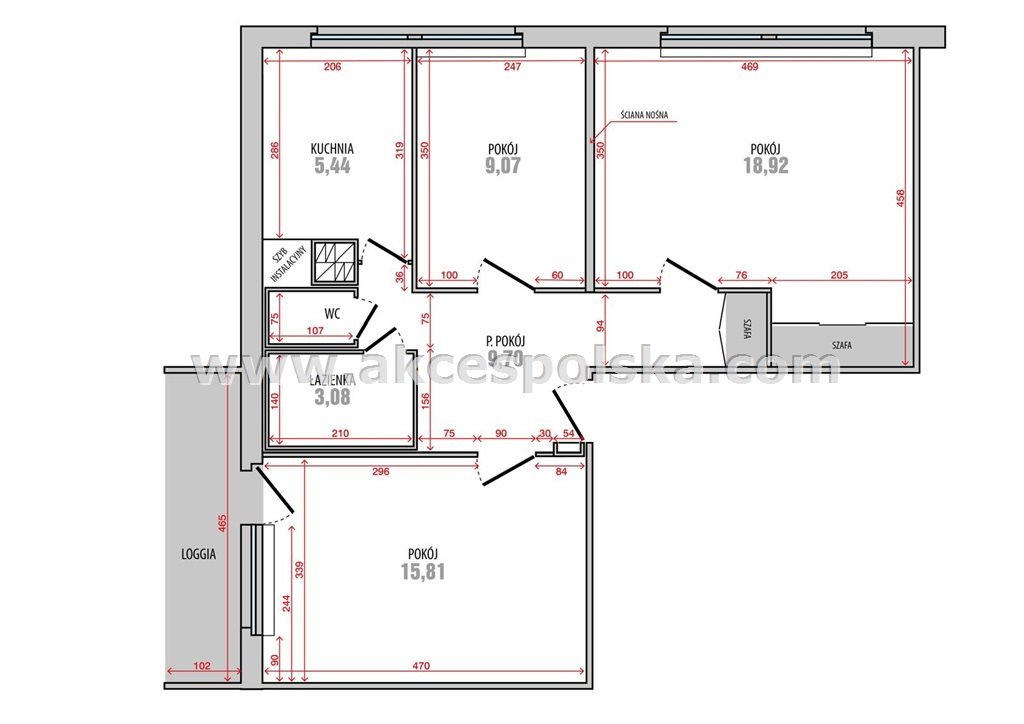 19,9m2, 15,8m2,9m2, kuchnia 5,4m2, łazienka 3m2, wc, przedpokój 9,7m2.