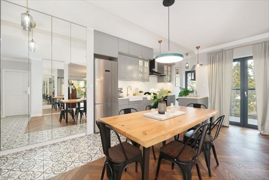 Szczególną uwagę należy zwrócić na wystrój w stylu art deco i wyposażenie apartamentu. Lokal jest wyposażony w stałą zabudowę kuchenną oraz sprzęt AGD (lodówka, zamrażarka, zmywarka, okap, płyta grzewcza elektryczna oraz piekarnik elektryczny). Mieszkanie jest sprzedawane wraz z częściowym umeblowaniem (poza fotelem, dużą szklaną witryną w salonie, wiszącą witryną w kuchni, meblami balkonowymi i TV).