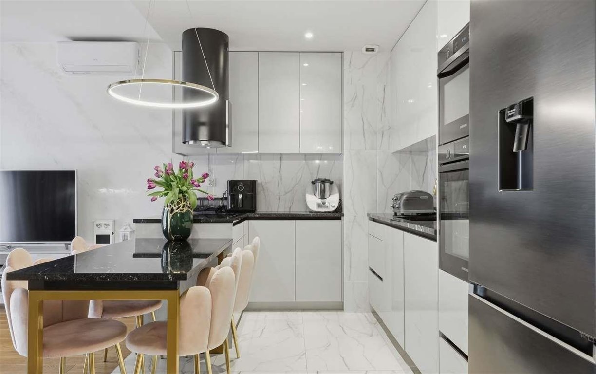 wszelkie zabudowy meblowe zostały wykonane na zamówienie przez stolarza, blat w kuchni i jadalni został wykonany z trwałego i eleganckiego granitu