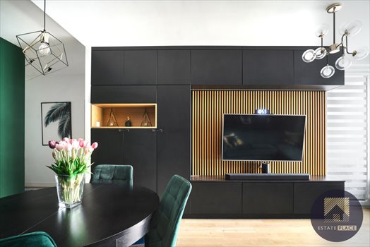 • Salon z aneksem kuchennym - nowoczesna, otwarta przestrzeń oraz zabudowa wykonana na wymiar. Wysokiej klasy sprzęt AGD renomowanych marek podkreśla komfort codziennego użytkowania.