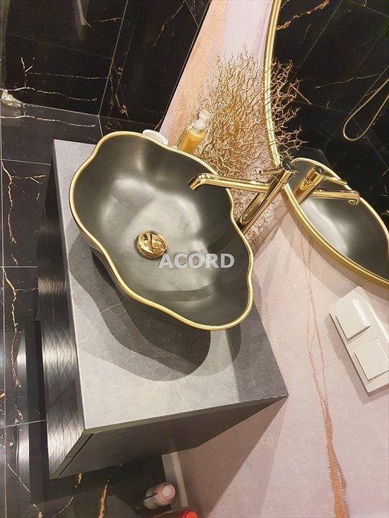 Super elegancka łazienka w złoto czarnej tonacji z piękną armaturą i oświetleniem. Ścianka prysznicowa walk-in z szybą, zestaw prysznicowy podtynkowy z deszczownicą w kolorze złotym, umywalka nadblatowa, miska wc wisząca, szafki łazienkowe, lustro, piękne dodatki i dekoracje w kolorze złota, blat łazienkowy Łupek Jura.