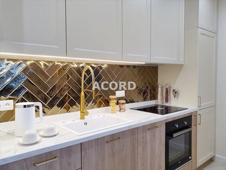 Sprzęt markowy, blat kuchenny ze spieku kwarcowego, złote matowe baterie.