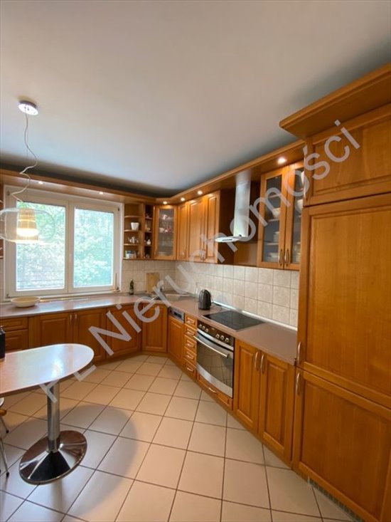 Kuchnia wyposażona jest w zabudowę stałą robioną pod wymiar oraz wszelkie niezbędne sprzęty AGD (zmywarka, piekarnik, płyta ceramiczna, lodówko-zamrażalka. Utrzymana w tonacji brązowej (fronty dębowe).