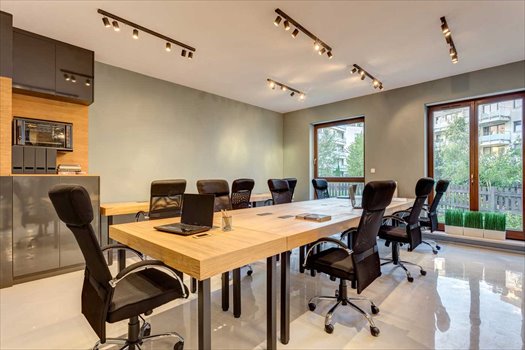 Biuro posiada dwa duże pokoje do pracy wyposażone w stoły i krzesła, wykonane na zamówienie. Oprócz tego oszklona sala ze stołem konferencyjnym i zestawem krzeseł.