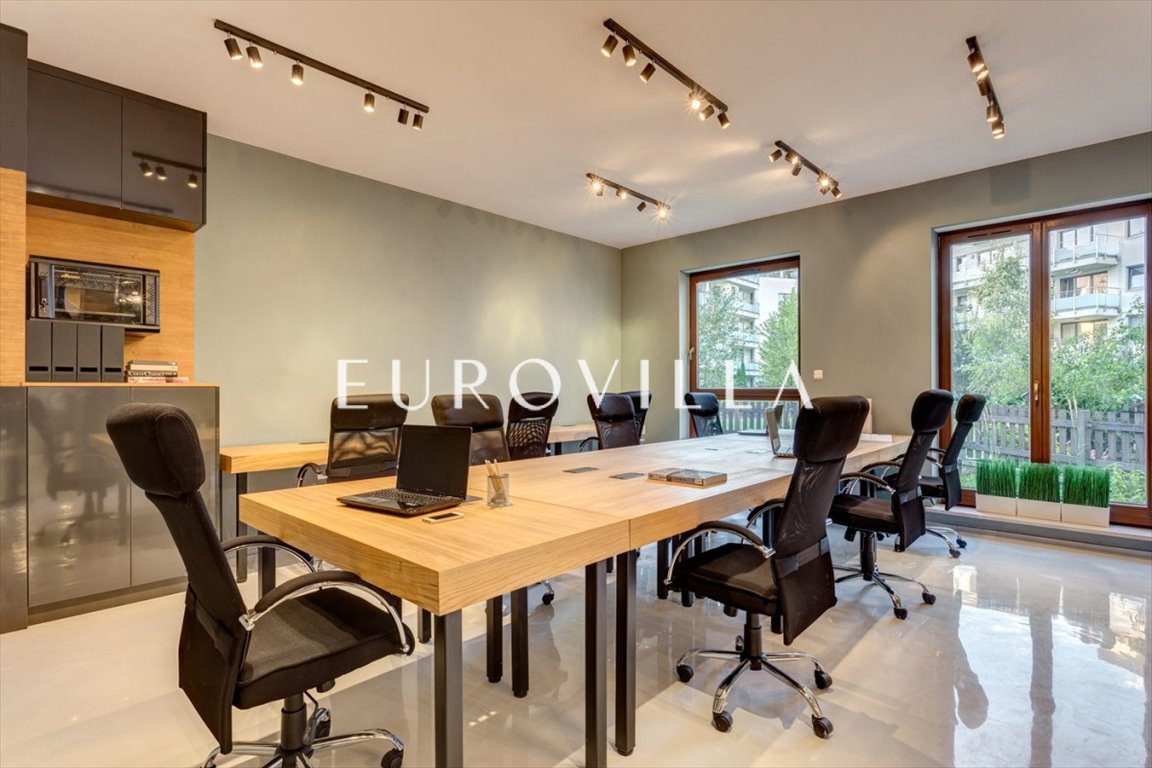 EUROVILLA prezentuje w nowoczesny apartament przystosowany na cele biurowe położony w Miasteczku Wilanów. Idealne pod prestiżową siedzibę firmy lub biuro dla kreatywnego zespołu. Powierzchnia została podzielona na dwa open space'y, salę konferencyjną i zaplecze socjalne z aneksem kuchennym. Dużą zaletą są 2 ogródki przynależne do nieruchomości, na których można się zrelaksować od pracy.
