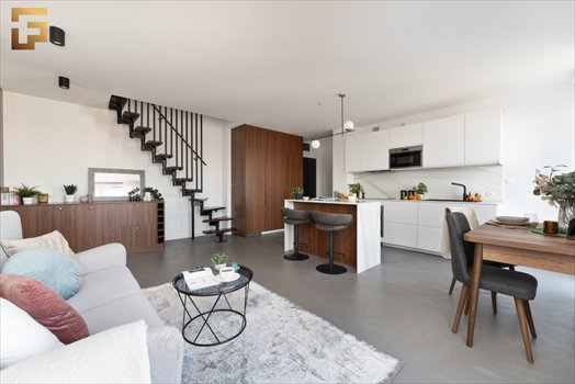 Przedstawiamy Państwu wyjątkowe dwupoziomowe mieszkanie. Staranne wykonanie jak i zaplanowana aranżacja prezentuje się elegancko i świeżo. Na podłodze mamy mikrocement dekoracyjny w kolorze light-grey, na antresoli zostały położone panele podłogowe w kolorze ciemnego brązu. Zabudowa salonowa oraz kuchenna została wykonana na zamówienie w kolorze orzechowym firmy Kronospan.