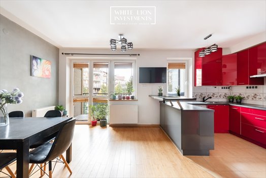 Salon z aneksem kuchennym - 22,87 m² : połączony z balkonem z widokiem na patio. W salonie znajdziemy wygodny sofę, telewizor oraz stół z krzesłami; Aneks kuchenny wyposażono w meble na wymiar oraz pełną zabudowę AGD: zmywarkę, okap, piekarnik, mikrofalówkę, płytę indukcyjną oraz dużą lodówko-zamrażarkę.