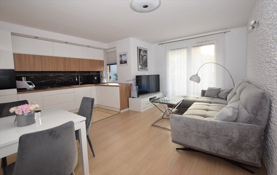 Przestronna i doskonale doświetlona przestrzeń dzienna z wyjściem na balkon i widokiem na osiedle. Aneks kuchenny z zabudową na wymiar i sprzętem AGD w cenie.