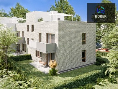 Na sprzedaż trzypokojowe mieszkanie położone w nowoczesnym budynku dwukondygnacyjnym składający się z jedenastu budynków mieszkalnych jednorodzinnych, dwulokalowych w niskiej zabudowie. Inwestycja oferuje 11 mieszkań na parterze z ogrodami oraz 11 na piętrze z przestronnymi tarasami na dachu budynku otoczonymi zielenią i panoramicznym widokiem na okolicę.