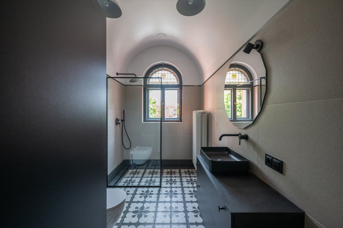 Nowoczesna łazienka z charakterem łukowy sufit i oryginalne okna z witrażami podkreślają klimat kamienicy. Stylowe wykończenie, czarno-biała posadzka i czarna armatura tworzą spójną, elegancką przestrzeń.
