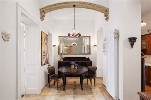 To wnętrze, w którym klasyczna elegancja spotyka się z ciepłem naturalnych materiałów. Podłogi wykończone zostały szlachetną deską oraz marmurem, a całość aranżacji opiera się na harmonijnej palecie jasnych, naturalnych barw - bieli, beży i ciepłych odcieni drewna. Starannie dobrane detale - dekoracyjne tapety, drewniane elementy i subtelne akcenty retro - nadają przestrzeni wyjątkowego charakteru, jednocześnie zachowując ponadczasową elegancję typową dla kamienicznych wnętrz. Centralnym miejscem mieszkania jest drewniana kuchnia, która przyciąga wzrok swoim stylem i solidnym wykonaniem. Wnętrza są w pełni umeblowane i gotowe do zamieszkania, zachowując przy tym niezwykle przytulny i reprezentacyjny charakter.