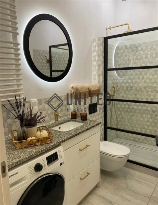 Sprzęty: lodówka z zamrażarką, piekarnik, płyta indukcyjna, wyciąg kuchenny, pralko-suszarka, zmywarka.
