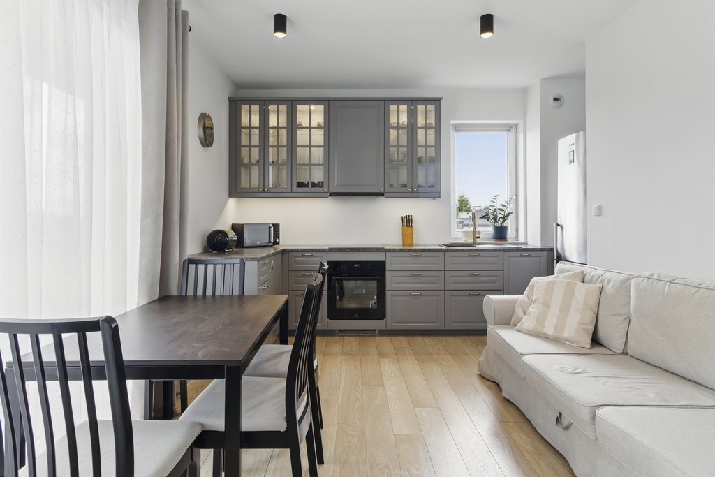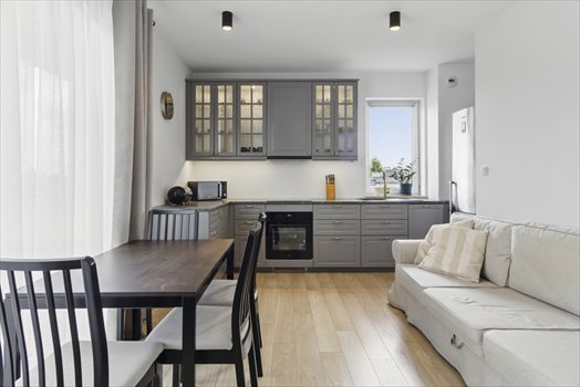 APARTMENT: The apartment is 60m², well-laid out, with ample storage space. The price includes a large storage unit. Very nicely finished and maintained. The living room with kitchenette is approximately 21m². The kitchen is very well-equipped, and has barely been used. The room is approximately 9m² and can be used as a bedroom, children's room, or study. Bedroom approx. 8.5m² with a large bed and a new mattress. Bathroom approx. 5m² with a shower, large sink and cabinet, washing machine, and toilet. Hallway approx. 11m² with a large built-in wardrobe. BUILDING: Equipped with an elevator and underground parking. On the ground floor, next to the entrance to the premises, we have a bakery. The building is fenced and has access control. The apartment includes a parking space.