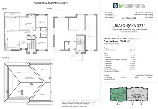 mieszkanie piętro 187,64m2 powierzchni całkowitej, 104,64 m2 powierzchni użytkowej, salon + 3 sypialnie, poddasze (83m2 po podłodze, 61m2 powierzchni powyżej 220 cm) LOKALIZACJA