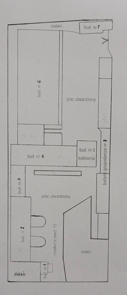 6. Budynek produkcyjny z łącznikiem - 808,9m2 - budynek o konstrukcji żelbetowej, dach dwuspadowy kryty papą, ze świetlikami, posadzki cementowe, wewnątrz i zewnątrz otynkowany, stolarka okienna i drzwiowa drewniana, budynek wyposażony w instalację elektryczną światła i siły, instalację wodną i kanalizacyjną oraz instalację centralnego ogrzewania z przyłączem do lokalnej kotłowni.