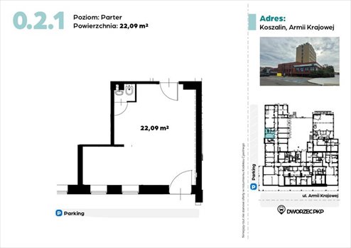 Ścisłe centrum, miejsce doskonale zlokalizowane z każdą częścią Koszalina. PARKING, PARTER, WEJŚCIE OD ULICY.Lokal o powierzchni 22,09 m2, składający się z jednego pomieszczenia oraz miejsca na węzeł sanitarny. Najważniejsze atuty: Bezpośrednie wejście z ulicy i parkingu, co zapewnia wyjątkową wygodę użytkowania i doskonałą ekspozycję.posiada węzeł sanitarny – dostęp do wody i kanalizacji.Światłowód w budynku gwarantuje szybki i stabilny Internet, Dodatkowe połączenie z resztą budynku przez wspólny korytarz. Idealne na działalność: gabinety beauty & wellness (kosmetologia, masaż, manicure)biura podróży, agencje nieruchomości, punkt konsultacyjnymałe biuro IT, księgowość, pracownie projektowebutik, sklep specjalistycznymini punkt gastronomiczny typu food‑to‑go lub kawiarnia Dlaczego warto? Kluczowa lokalizacja: centrum miasta, duży ruch pieszy, zaraz przy dworcuEkspozycja od strony ulicy i parkingu – świetna widoczność i dostępGotowe do adaptacji wnętrze, pod podział funkcji według potrzeb