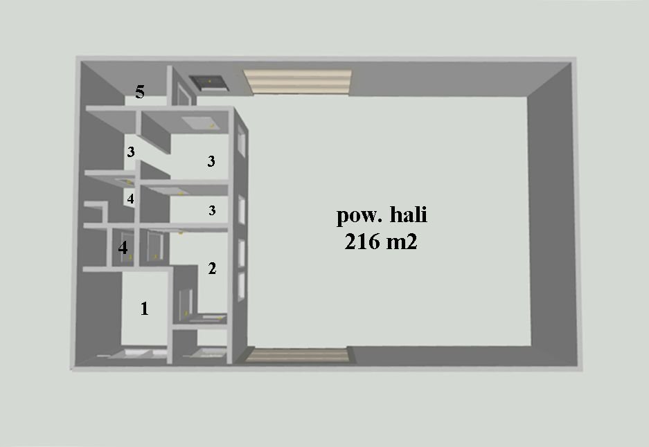 Hala o pow ok 300 m2 , składająca się z głównej sali o pow ok 216 m2, oraz pomieszczeń biurowo- socjalnych o pow. ok 84 m2.