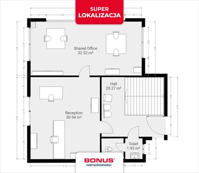 - Dużego biura open space – 32,52 m² (przestrzeń dla kilku stanowisk pracy)