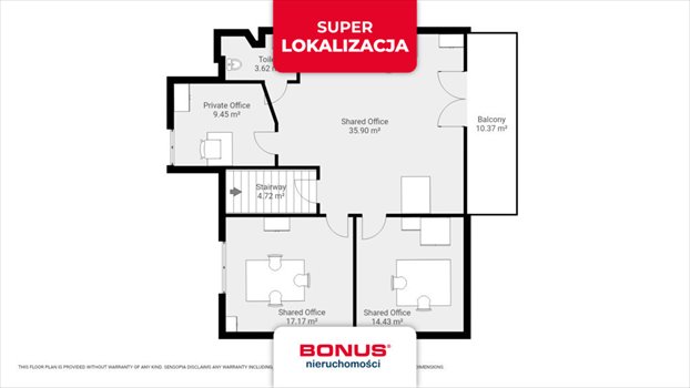 - Dużego biura open space – 35,90 m² (przestrzeń dla kilku stanowisk pracy)