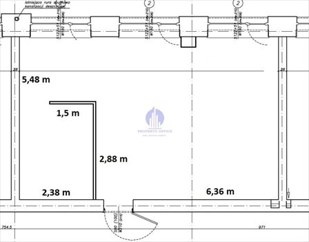 Jedno duże pomieszczenie biurowe z częściowo wydzielonym magazynkiem/aneksem kuchennym.
