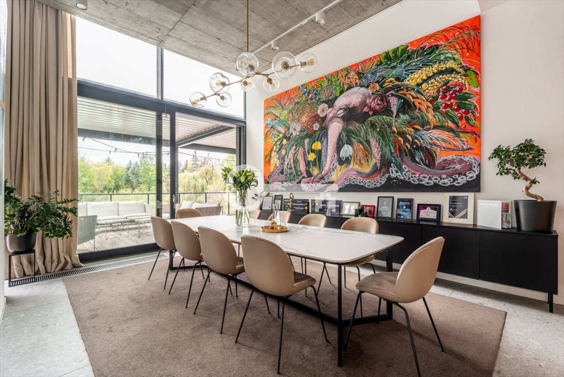 * Duże, panoramiczne przeszklenia, które zapewniają doskonałe doświetlenie wnętrza i otwierają widok na otaczającą zieleń.