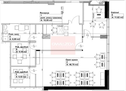 Aktualny układ biura, jak na załączonym planie. Łazienki w części wspólnej.