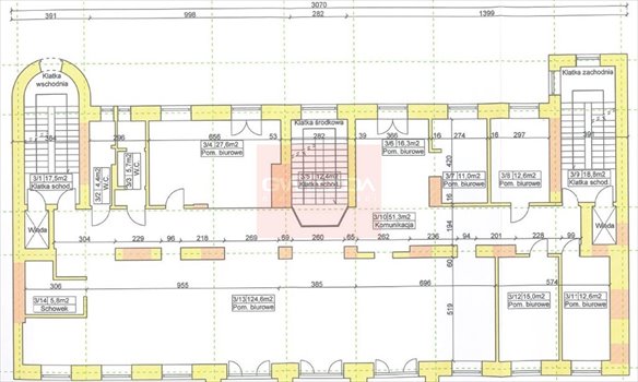 Do wynajęcia powierzchnia biurowa na piętrze drugim 299 mkw. podzielona obecnie na gabinety i pomieszczenia socjalne.