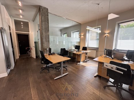Do wynajęcia nowoczesny lokal o powierzchni 100m2 z przeznaczeniem na biuro, kancelarię, firmę consultingową, showroom, atelier. Bezpośrednie wejście do lokalu z chodnika. Duża przestrzeń jest podzielona na mniejsze pomieszczenia funkcjonalne: recepcja, przeszklona sala konferencyjna, dwa osobne gabinety oraz przestrzeń typu open space. Dodatkowo, w lokalu znajduje się również kuchnia, toaleta, miejsce na serwerownię oraz hol wejściowy.