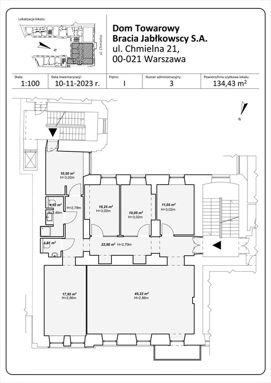 Oferujemy do wynajęcia lokal biurowy o powierzchni ok. 134 mkw. należący do Spółki Dom Towarowy Bracia Jabłkowscy S.A., położony na pierwszym piętrze zabytkowej Kamienicy Jabłkowskich przy ul. Chmielnej 21 – tuż obok Placu 5 Rogów.