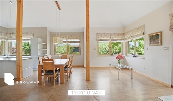 Dom parterowy o powierzchni 183,27 m², wybudowany w 2012 roku, oferuje wyjątkowy komfort i przestrzeń. Składa się z pięciu pokoi, dwóch łazienek, kuchni, jadalni oraz przestronnego pokoju dziennego. Wnętrza wykończone z wysokiej jakości naturalnych materiałów, takich jak drewno i kamień, zapewniają niepowtarzalny charakter i ciepło domowego ogniska. Duże przeszklenia pozwalają na pełne korzystanie z uroków otaczającej przyrody. Ogrzewany piecem na ekogroszek oraz kominkiem z płaszczem wodnym. Latem woda podgrzewana jest poprzez elektryczny bojler. Budynek wyposażony w przydomową stację uzdatniania wody. Teren ogrodzony i monitorowany. Wygodna elektrycznie otwierana furtka, brama wjazdowa i garażowa. Podjazd wyłożony kostką brukową. Budynek przyłączony do światłowodu.