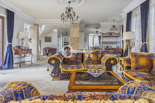Nieruchomość jest umeblowana i posiada kompletne wyposażenie. Na parterze znajdują się również 2 garderoby. Z tego poziomu jest również wyjście na zadaszony taras z barem - idealne miejsce na grilla - oraz piękny zadaszony basen. Na parterze podłoga jest wyłożona wysokiej jakości gresem z wstawkami mosiężnymi Versace.