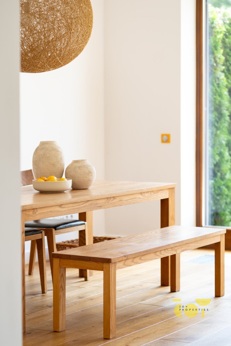 In addition to its simplicity and functionality, this house is characterized by purity of form. It was designed with attention to detail, combining modernity with comfort and practicality. Bright spaces, natural materials, high ceilings, and large wooden windows create a unique atmosphere—perfect for families, diplomats, or people on international assignments.