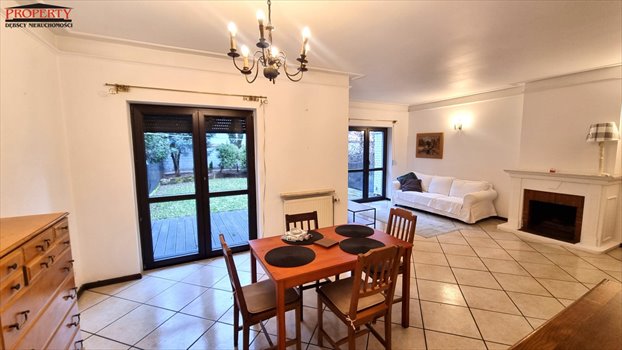 w części jadalnej: stół, 4 krzesła, komoda, zegar z salonu dwa wyjścia do ogrodu, taras w terakocie,