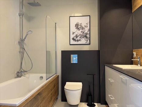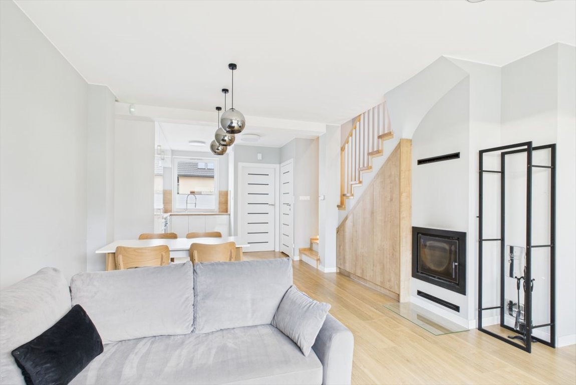 Kuchnia w zabudowie ze sprzętem AGD (lodówka, piekarnik, okap, płyta indukcyjna, zmywarka). W łazience wanna a na wyposażeniu pralka. W sypialniach zabudowy; w jednej łóżko małżeńskie a w drugiej kanapa z funkcją spania. W salonie na wyposażeniu kanapa narożna i stół z 4 krzesłami. W chwili obecnej szambo - zainstalowany czujnik. Piec gazowy dwufunkcyjny. Ogrzewanie podłogowe (na dole + łazienka u góry). Dodatkowo w salonie kominek na drewno. Oświetlone, drewniane schody. Alarm. Rozprowadzona instalacja TV oraz internet w każdym pokoju. Czujnik czadu. Średnio miesięczne opłaty ok 600 zł (woda, prąd, gaz, szambo, śmieci). Dom wykończony w 2023 roku. Dom jest w bardzo dobrym stanie. Warunki najmu: czynsz dla właściciela 5000 zł + opłaty eksploatacyjne wg zużycia. Wymagana kaucja. Najem długoterminowy.