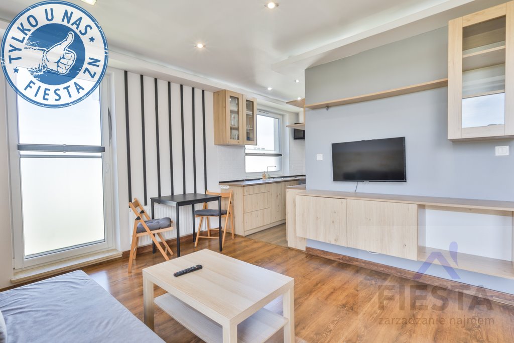 Mieszkanie w pełni wyposażone w sprzęt AGD oraz meble. W części kuchennej m.in lodówka, płyta grzewcza, piekarnik, okap, zmywarka, zabudowa meblowa oraz stół z dwoma krzesłami, W części dziennej rozkładana kanapa, szafa, szafka RTV. W łazience wanna z funkcją prysznica, pralka, szafki. W przedpokoju szafa garderobiana.