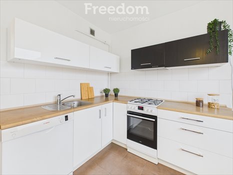 Mieszkanie jest częściowo umeblowane. W kuchni znajduje się zabudowa meblowa (szafki, półki, szuflady), piekarnik, płyta gazowa, okap, zmywarka, lodówka (nie ma na zdjęciu) oraz zlewozmywak. Pozostawiono również przestrzeń na wydzielenie części jadalnianej lub niewielkiej strefy dziennej. W łazience do dyspozycji najemcy jest WC, umywalka z szafką oraz duża wanna. Pozostawiono także osobne miejsce na pralkę. W pokoju zamontowano pojemną szafę w zabudowie na całą ścianę oraz stolik - reszta przestrzeni pozostaje do indywidualnej aranżacji, zgodnie z potrzebami przyszłego najemcy. Dodatkowo w przedpokoju znajduje się szafa, która zapewnia jeszcze więcej miejsca do przechowywania.