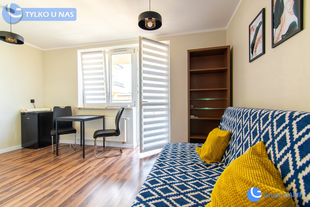 Mieszkanie składa się z pokoju dziennego (umeblowany o rozkładaną sofę, szafę, komodę, stół z 2 krzesłami, regał), aneksu kuchennego ( wyposażony o meblu w zabudowie, zmywarkę, lodówkę, płytę indukcyjną dwupalnikową), przedpokoju (umeblowany o przestronną szafę), łazienki (pralka, prysznic) oraz balkonu.