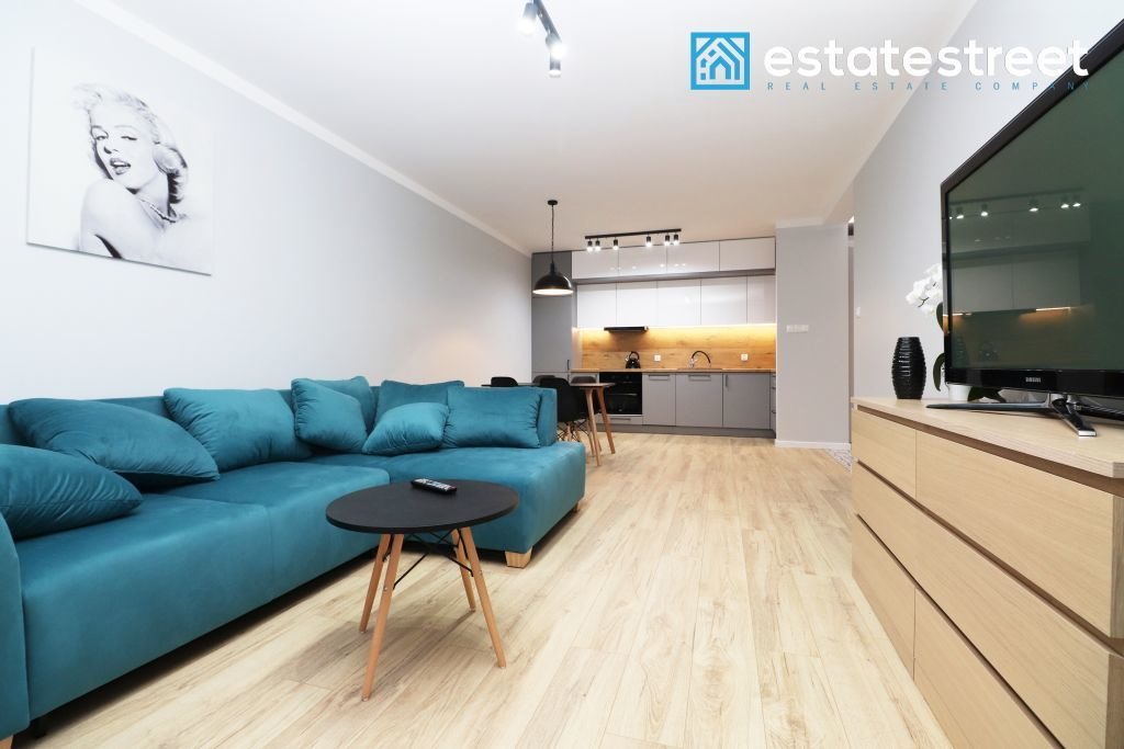 The apartment is located on the high ground floor of a modern building from 2020. The area of approx. 42 m2 consists of: living room with kitchenette, hall and bathroom. The interior is equipped and furnished. In the living room there is a sofa with a sleeping function, a coffee table, a TV cabinet, a 50 inch TV and a table with chairs. Open kitchen with high-quality household appliances and a dishwasher. Bathtub in the bathroom, two spacious wardrobes in the hall with many storage systems. Cozy, spacious and bright interior - southern exposure. The apartment includes a balcony. Ready to move in from 1st of May.