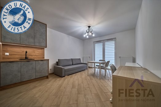 Mieszkanie składa się z otwartej przestrzeni z aneksem kuchennym, wyjściem na balkon, przestrzenią przedpokoju oraz łazienki. Pokój umeblowany - kanapa rozkładana, komoda, biurko, fotel biurowy, stół i krzesła. Kuchnia w formie aneksu, wyposażona w zabudowę meblową na wymiar oraz w sprzęt AGD (zmywarka, lodówka z zamrażarką, płyta indukcyjna, okap). W łazience kabina prysznicowa, pralka, umywalka oraz WC. W przedpokoju zamontowana szafa w zabudowie. Do mieszkania przynależy balkon.