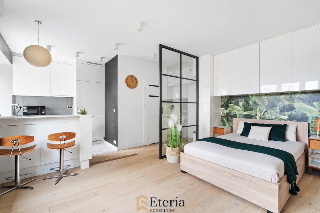 To nie tylko sprytnie urządzona kawalerka – to w pełni przemyślana, ciepła i wygodna przestrzeń, w której wszystko ma swoje miejsce.