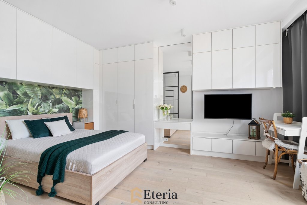 - Zabudowa i szafy – dużo miejsca do przechowywania w wysokich, pojemnych szafkach