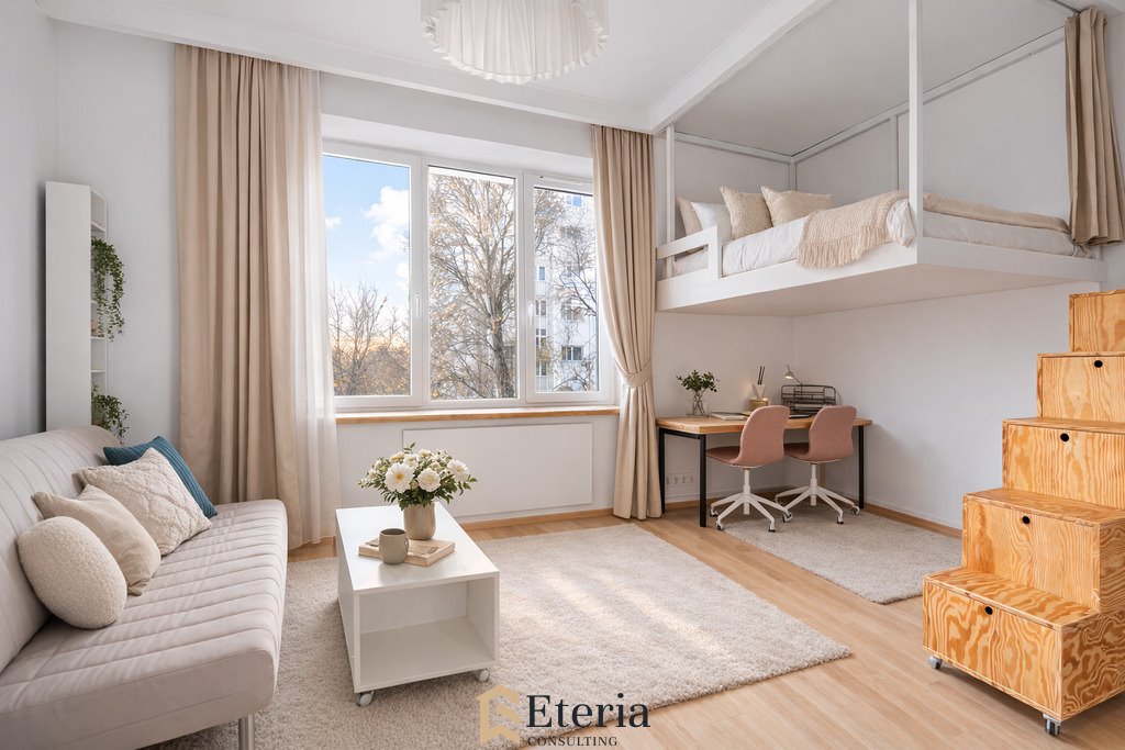 Jeśli szukasz miejsca, w którym naprawdę można odetchnąć — takiego, które otula spokojem i daje poczucie, że jesteś u siebie — ta kameralna kawalerka będzie idealna. Wysokie sufity, ciepłe światło, przytulna antresola tworzą wnętrze, do którego chce się wracać. To małe, miejskie gniazdko zaprojektowane tak, by dawać komfort i codzienny spokój.