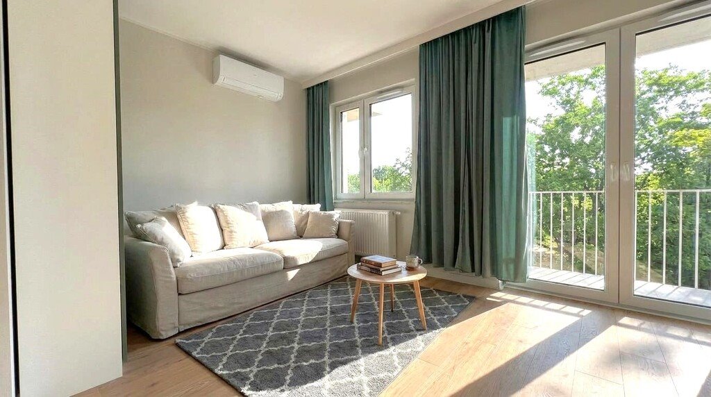 Mieszkanie jest jasne, słoneczne i klimatyzowane – idealne zarówno do pracy zdalnej, jak i relaksu po pracy.