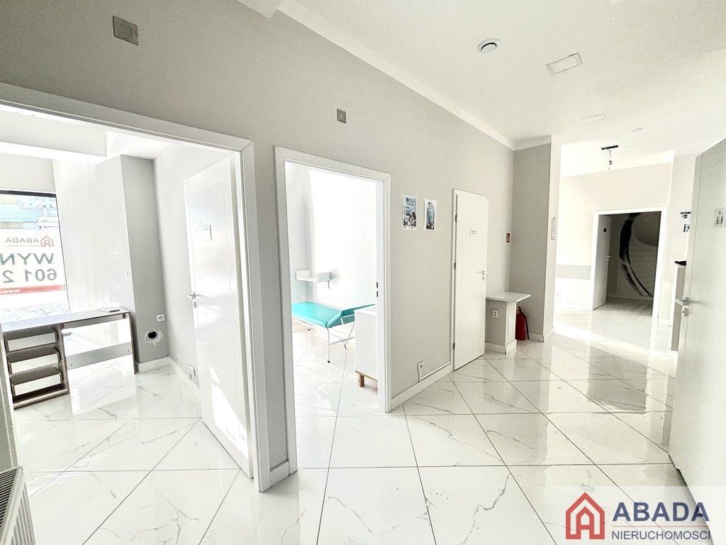 Finished premises (no transfer fee), large display windows, five offices, and parking in front of the premises. The premises are surrounded by dense multi-family housing. Over 2,000 apartments. The premises have a large display window facing the main street. A bus stop is located nearby. The premises are ideal for veterinary services, massages, spas, psychological offices, dentistry, rehabilitation, aesthetic medicine, or any other services.