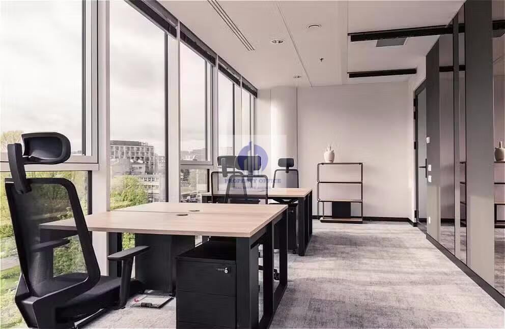 Biuro z gotowymi stanowiskami pracy, wyposażony w biurka, krzesła i szafki.